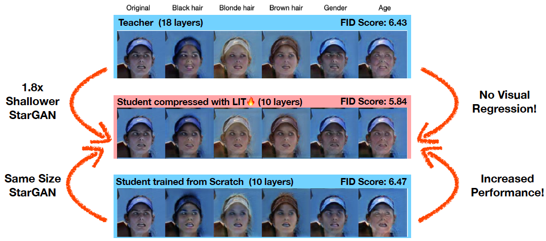 LIT can be easily extended to compress GANs as well. LIT is able to compress a StarGAN by over 1.8x on the Celeb A dataset, with no visual performance regression. In fact, the compressed student model produces cleaner images in many cases: the student model has a FID score of 5.84 compared to the teacher with a FID score of 6.43 (where a lower FID score is better).