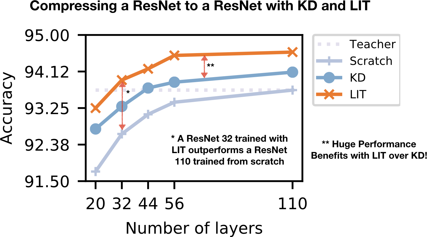 LIT improves model compression for modern DNN architectures by taking advantage of multiple intermediate representations of a teacher model to train a shallower, faster student model. LIT can compress a wide range of models, including ResNets, ResNeXts, VDCNNs, and even StarGAN on a variety of tasks without loss in accuracy.